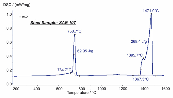 圖中顯示的是鋼(SAE 107)的相結(jié)構(gòu)轉(zhuǎn)變測(cè)量。在 751°C 前后,發(fā)生了兩種相互重疊的相變過程,735°C 之前熱流的平緩增大是由居里轉(zhuǎn)變(鐵磁性能的轉(zhuǎn)變)引起,而高而尖銳的主峰則由結(jié)晶結(jié)構(gòu)的改變(鐵素體轉(zhuǎn)變成奧氏體)所致,其相應(yīng)吸熱熱焓為 63J/g。在 1367°C 可以觀測(cè)到兩步熔融過程(峰值在 1395°C 與 1471°C),熔融熱焓為 268 J/g。