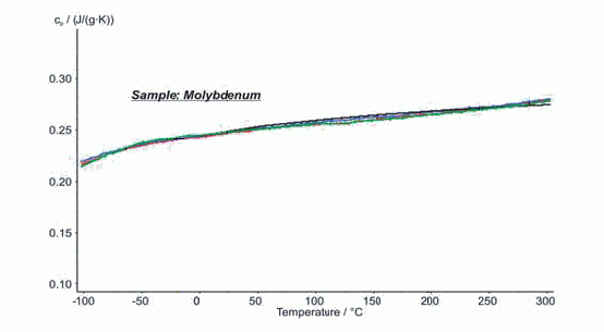 使用DSC 404 F1 Pegasus® 新型低溫爐體測(cè)試金屬鉬從-100°C~300°C之間的比熱,實(shí)驗(yàn)重復(fù)測(cè)試三次。三次測(cè)試結(jié)果的分散度很小,在2%以內(nèi)。圖中黑色曲線是純金屬鉬室溫至300°C的文獻(xiàn)值,測(cè)試數(shù)據(jù)與文獻(xiàn)值的偏差小于2%。這表明DSC 404 F1 Pegasus® 在低溫依然保持很好的性能。
