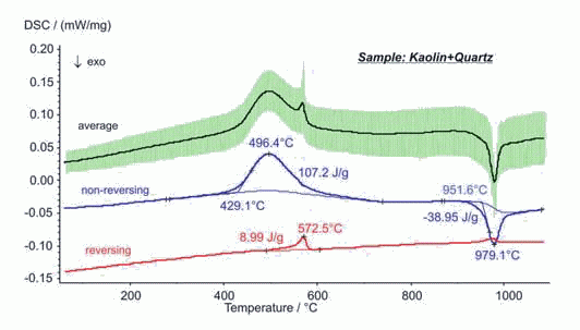 TM-DSC 通常被用于高分子材料的低溫測(cè)試,而 DSC 404 F1 Pegasus® 是世界上第一臺(tái)將TM-DSC應(yīng)用到高溫測(cè)試的儀器。圖中顯示的是高嶺土石英混合物的測(cè)試結(jié)果。在DSC不可逆曲線上可以觀察到高嶺土不可逆的脫水過程和相變。,而DSC可逆曲線上則觀察到石英在 573°C 的相變效應(yīng)。