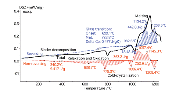 溫度調(diào)制 DSC(TM-DSC)是傳統(tǒng)上常用于測(cè)試聚合物低溫應(yīng)用的工具。STA 449 F1 Jupiter® 和 DSC 404 F1 Pegasus® 是市面上最早實(shí)現(xiàn)高溫溫度調(diào)制的儀器。下圖所示為絕緣礦物纖維的測(cè)試結(jié)果。在 DSC 總熱流曲線中,馳豫、氧化和玻璃化轉(zhuǎn)變是重疊的。只有從分離得到的 DSC 可逆熱流曲線上,才能準(zhǔn)確分析樣品的玻璃化轉(zhuǎn)變。