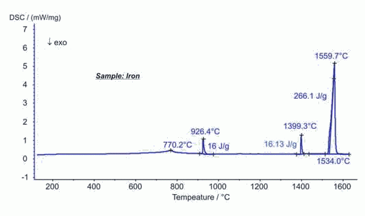 這個數(shù)據(jù)是在配備銠爐體的DSC 404 F3 Pegasus® 上測試得到的,實(shí)驗(yàn)溫度從室溫至1620°C。在770°C處出現(xiàn)的峰是材料的磁性能發(fā)生變化(居里轉(zhuǎn)變)引起的。926°C和1399°C處的峰是材料的晶型轉(zhuǎn)變引起的??赡苁且?yàn)樵摌悠分羞€有雜質(zhì),得到的數(shù)據(jù)與文獻(xiàn)值略有差別。熔融出現(xiàn)在1534°C,熔融熱為266.1J/g,與純鐵的文獻(xiàn)值偏差為1.5%