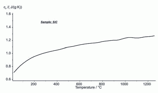 碳化硅在很多領(lǐng)域中都有應(yīng)用,在鋼鐵企業(yè)中它被用于汽車排氣系統(tǒng)的過濾裝置中,也用作離合器以及高溫爐體的加熱元件中。圖中顯示的是碳化硅在室溫到1200°C 范圍內(nèi)的比熱測試數(shù)據(jù)。圖中碳化硅的比熱增加趨勢符合德拜原理,在高溫處比熱表現(xiàn)為微弱的溫度依賴性,遵循杜隆—珀替定律。