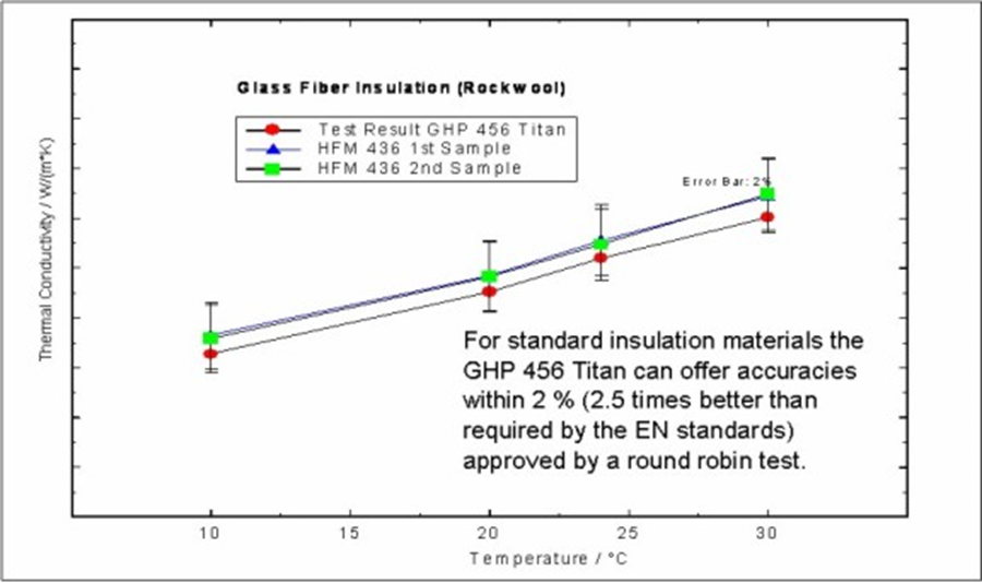 礦棉是一種用途廣泛的材料,主要用于住宅建筑的保溫。本例使用保護(hù)熱板法(GHP 456 Titan)和熱流法(HFM 436 series),對(duì)礦物纖維在 10℃ 到30℃ 之間進(jìn)行循環(huán)測(cè)試,研究其導(dǎo)熱性能。和其他大多數(shù)保溫材料類似,礦物纖維在室溫附近的導(dǎo)熱系數(shù)隨著溫度的升高呈線性增加。用不同的測(cè)試儀器得到的結(jié)果有很好的一致性。通過(guò)循環(huán)測(cè)試進(jìn)一步證明,保護(hù)熱板法的測(cè)試精度可以達(dá)到 2 %。