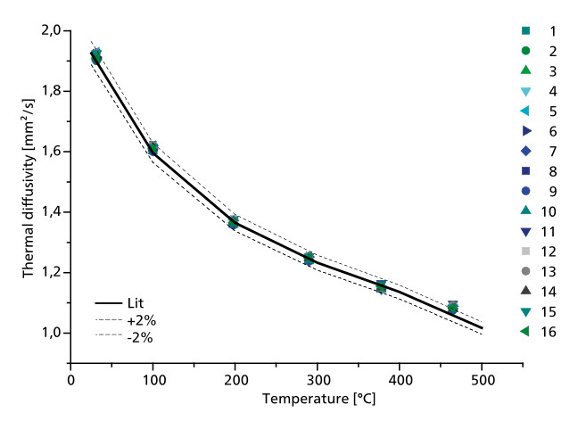 譜圖顯示了使用 LFA 467 一次裝載 16 個(gè) Pyroceram 樣品(厚度為 2.5mm,直徑為 12.7mm)進(jìn)行室溫至 500℃ 的測(cè)試。測(cè)量結(jié)果與理論值之間的偏差 < 2%。