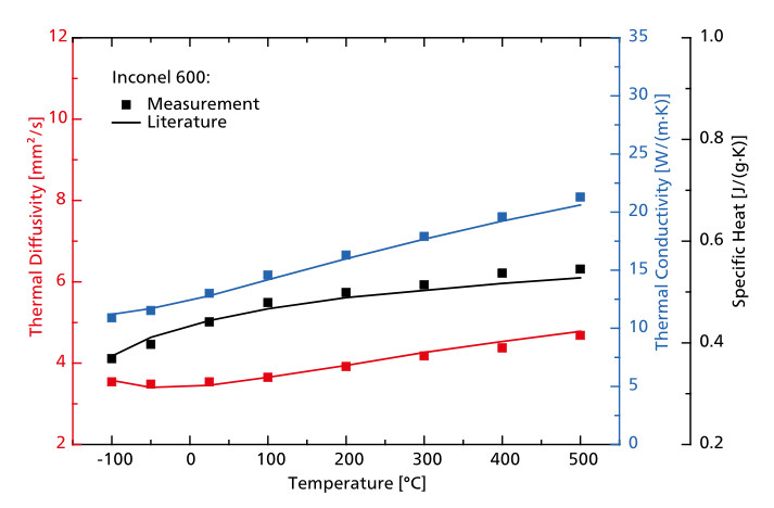 圖中曲線為標(biāo)樣 Inconel 600 的熱擴(kuò)散系數(shù)(紅點(diǎn))、導(dǎo)熱系數(shù)(藍(lán)點(diǎn))和比熱(黑點(diǎn))測(cè)試結(jié)果。測(cè)量覆蓋 LFA 467 HyperFlash® 完整溫度范圍(-100℃ 至 500℃)。與理論值(實(shí)線)相比,實(shí)測(cè)數(shù)據(jù)點(diǎn)的偏差均小于±3%,精度水平普遍好于±3%。