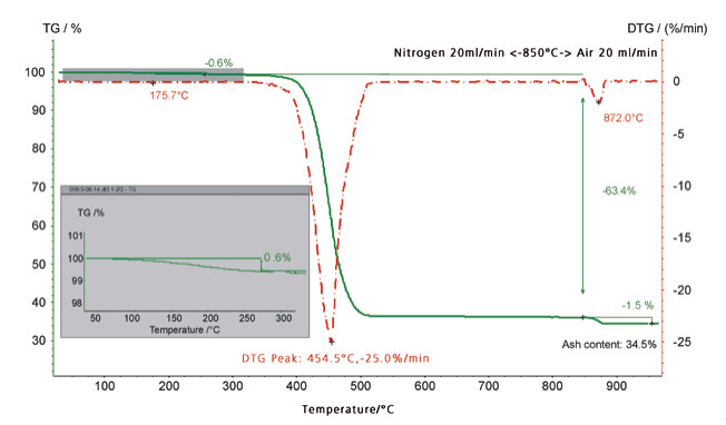 • 可對熱重曲線作一階微分(DTG)與二階微分,并可進(jìn)行峰值溫度標(biāo)注。