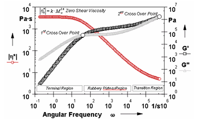 在低剪切或低角頻率下區(qū)域,聚合物的粘度與剪切速率或角頻率無關(guān),即存在零剪切粘度。零剪切粘度是一個(gè)重要的材料參數(shù),直接和平均分子量 Mw的 3.4 次方成正比。