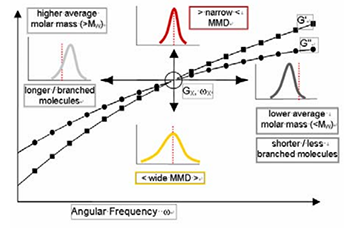 究模量交叉點(diǎn) Gx 的水平位置可以定性分析平均分子量,Gx 的垂直位置說明了分子量分布MMD。另外,比較同類聚合物,支化程度也和Gx 的水平偏移有關(guān)。