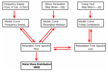 通過不同溫度下的頻率掃描,應(yīng)力松弛和、蠕變實(shí)驗(yàn),可以計(jì)算主曲線, 從而計(jì)算松弛時(shí)間譜;對(duì)于已知材料參數(shù)的聚合物(如 PS, PE, PP,