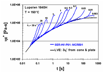 圖 6 描述了支化聚丙烯(B-PP)和高規(guī)整線性聚丙烯(H-PP)的差異。兩種聚丙烯的熔融指數(shù) MI 都是 3,粘度曲線也基本一致。在圖6,兩種聚丙烯在一定的拉伸應(yīng)力下,分子結(jié)構(gòu)的差異就變得很明顯。支化聚丙烯(B-PP)在圖 6a 中表現(xiàn)出明顯的支化效應(yīng),拉伸變硬。而高規(guī)整線性聚丙烯(H-PP)在圖 6b 的拉伸粘度并無明顯增大。