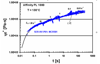 在150C°時(shí)LLDPE在低于0.01 S-1的剪切速率下的零剪切粘度為17500Pas(圖1)。對(duì)于LDPE,使用Carreau-Yasuda回歸方法計(jì)算出其在150C°時(shí)的零剪切粘度為76,850Pas。