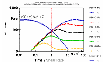 應(yīng)力階梯變化(蠕變及回復(fù))、應(yīng)變階梯變化(應(yīng)力松弛)、速率階梯變化(應(yīng)力增加/開始流動(dòng))可以測量材料對(duì)于給定剪切應(yīng)力、剪切應(yīng)變或剪切速率的時(shí)間(瞬時(shí))響應(yīng)。分析方法包括計(jì)算一些重要的材料參數(shù),如零剪切粘度、平臺(tái)模量、蠕變?nèi)崃亢蛯⑺矐B(tài)材料函數(shù)轉(zhuǎn)換為動(dòng)態(tài)材料函數(shù)- G’(ω)G”(ω)。圖六中,提供了應(yīng)力增加測試實(shí)例。