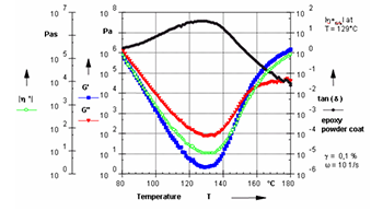 圖 9 為熱固性的環(huán)氧樹脂隨溫度的變化性能。通過流變學(xué)參數(shù)如模量或粘度隨溫度變化的曲線,我們可以很方便地判斷環(huán)氧樹脂的熔融溫度,凝膠化溫度和固化過程。若在恒定的熔融溫度下,跟蹤環(huán)氧樹脂的模量或粘度隨時(shí)間變化的曲線,我們可以得到固化時(shí)間和固化動(dòng)力學(xué)的信息。
