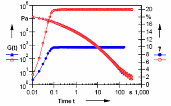 在這個(gè)實(shí)驗(yàn)中,施加一個(gè)恒定的應(yīng)變 Ý,測量應(yīng)力隨時(shí)間的變化曲線,通常用松弛模量 G(t)=ζ(t)/γ來表示。從圖 4 中可以看出,配置同步電子整流馬達(dá)(EC 馬達(dá))的流變儀可以在 100ms內(nèi)達(dá)到設(shè)定應(yīng)變,并且無過沖。兩個(gè)設(shè)定不同應(yīng)變的數(shù)據(jù)吻合的很好,也證明了所選應(yīng)變?cè)诰€性粘彈區(qū)內(nèi)。