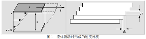 觀察河道中流水,水流方向一致,但水流速度不同,中心處的水流最快,越靠近河岸的水流越慢。因此在流速不太快時可以將流動著的液體視為由若干互相平行移動的液層所組成的,液層之間沒有物質(zhì)交換,這種流動方式叫層流,如圖 1。由于各層的速度不同,便形成速度梯度 dv/dh,或稱剪切速率。流動較慢的液層阻滯著流動較快液層的運動,使各液層間產(chǎn)生相對運動的外力叫剪切力,在單位液層面積(A)上所需施加的這種力稱為剪切應(yīng)力,簡稱剪切力(Shear Stress),單位為 N·m-2,即 Pa,以 τ 表示。剪切速度(Shear Rate),單位為 s-1,以表示。剪切速率與剪切應(yīng)力是表征體系流變性質(zhì)的兩個基本參數(shù)。