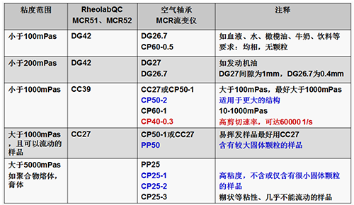 轉(zhuǎn)子的測量范圍既與轉(zhuǎn)子的大小、形狀有關(guān),也與流變儀主機的扭矩范圍有關(guān),同時還與需要達到的剪切速率、應(yīng)變等條件有關(guān),所以每個轉(zhuǎn)子的測量范圍由這幾個方面決定,都必須考慮,流變儀軟件中可以計算轉(zhuǎn)子的理論測量范圍,結(jié)果實例如下,在 MCR102 流變儀上,