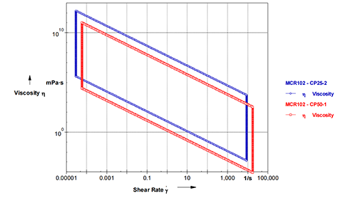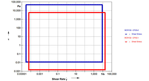 CP25-2 和 CP50-1 轉(zhuǎn)子的測量范圍,可以得到粘度范圍(Y 軸)、剪切速率范圍(X 軸)。