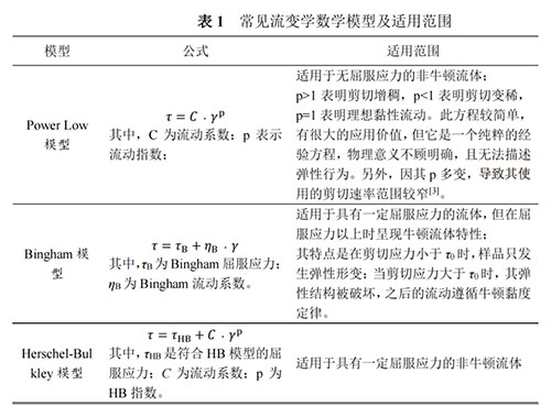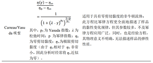 在對(duì)物質(zhì)的流變學(xué)特征進(jìn)行測(cè)定后,可以使用數(shù)學(xué)模型對(duì)測(cè)定結(jié)果進(jìn)行擬合,尋找與樣品的流變學(xué)特征相吻合的數(shù)學(xué)模型,計(jì)算出可以表征樣品流變學(xué)特征的關(guān)鍵參數(shù)。在穩(wěn)態(tài)流變學(xué)研究中,目前常用的流變學(xué)數(shù)學(xué)模型有Power Low 模型、Bingham模型、Herschel-Bulkley模型和Carreau/Yasuda模型[48]。