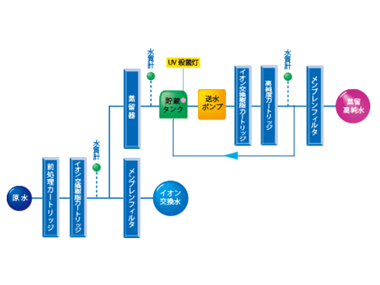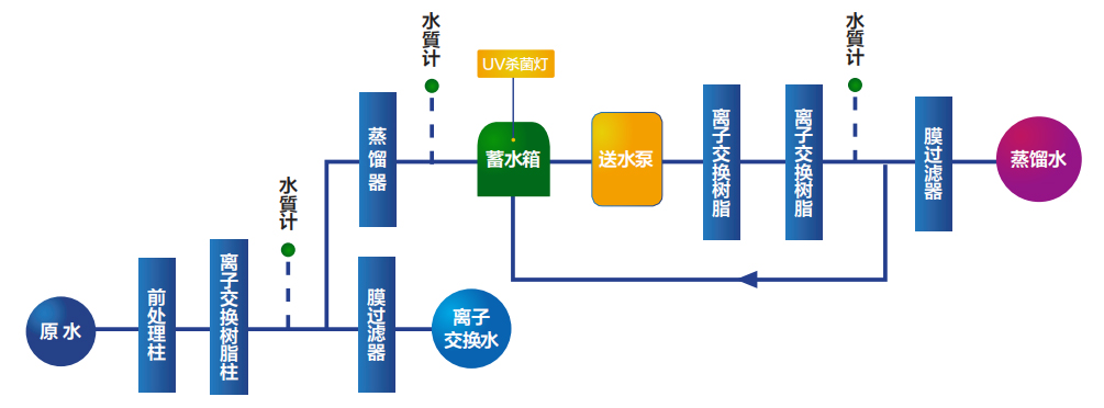 前處理樹(shù)脂→離子交換→蒸餾→水箱→離子交換→過(guò)濾 自動(dòng)循環(huán) ( 手動(dòng)循環(huán) ) |